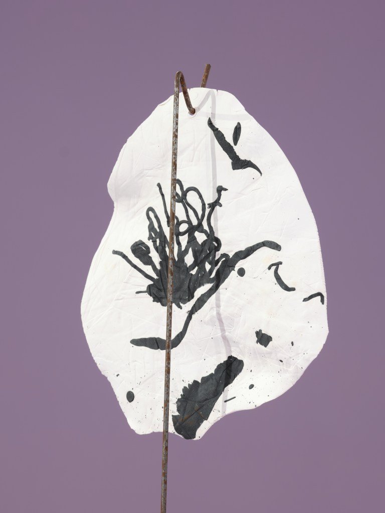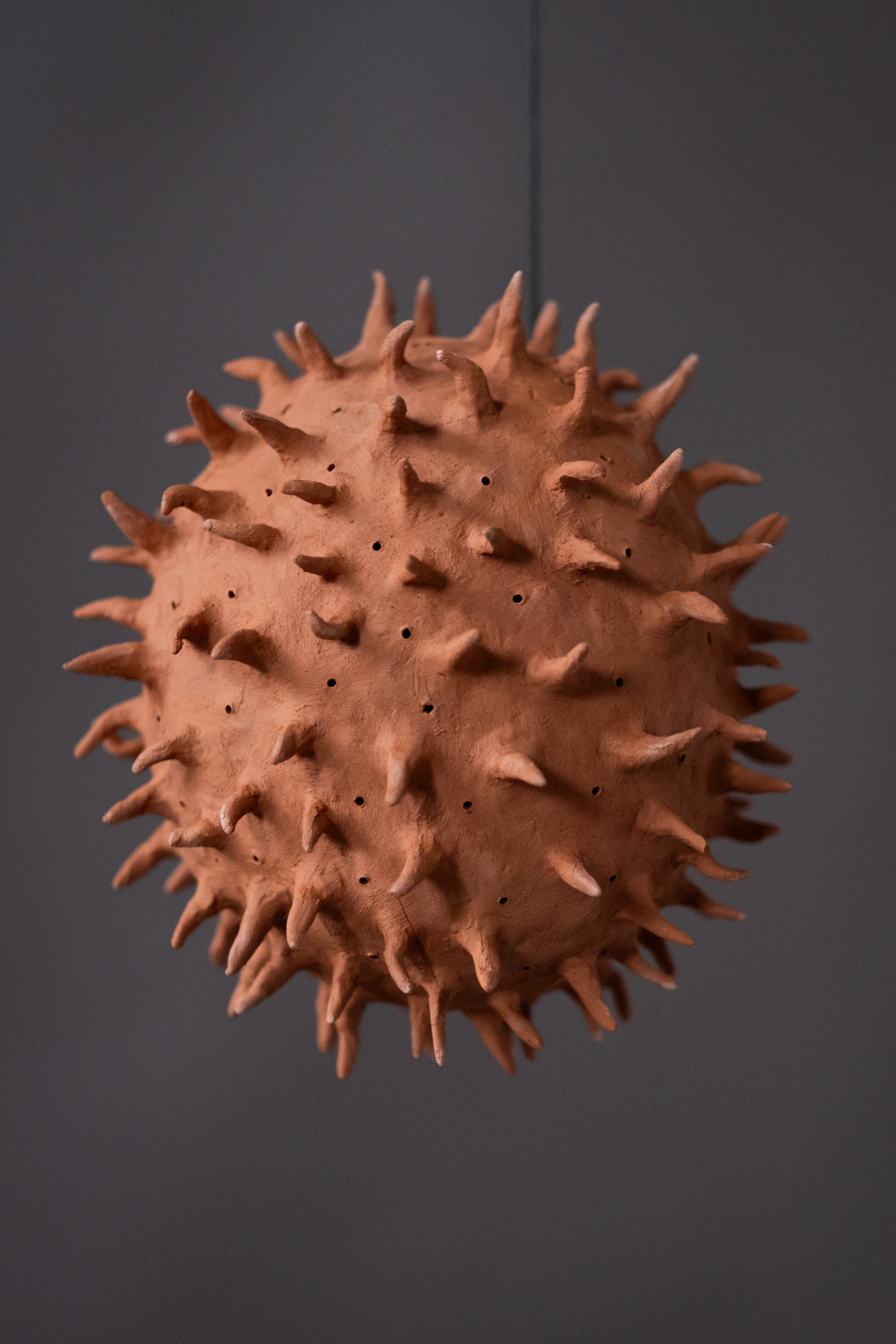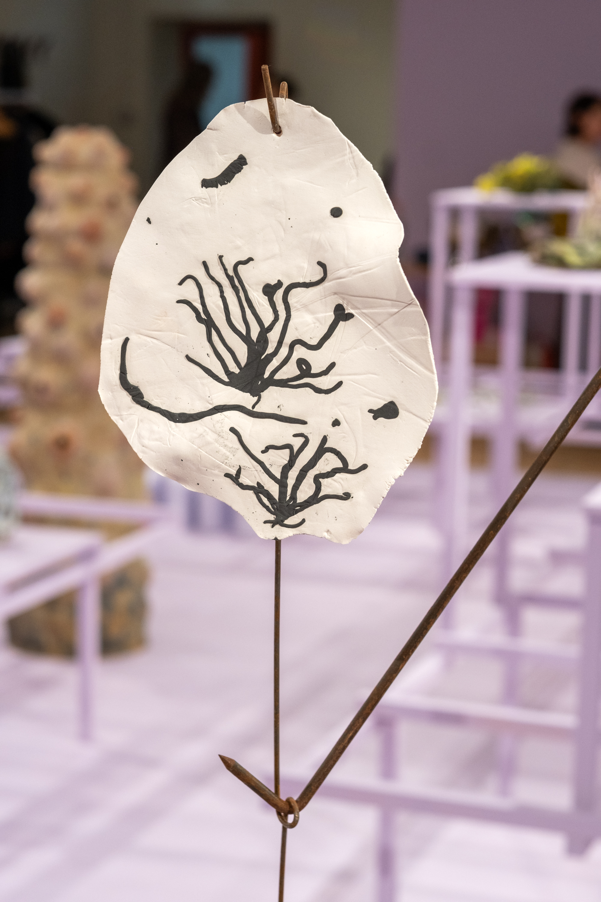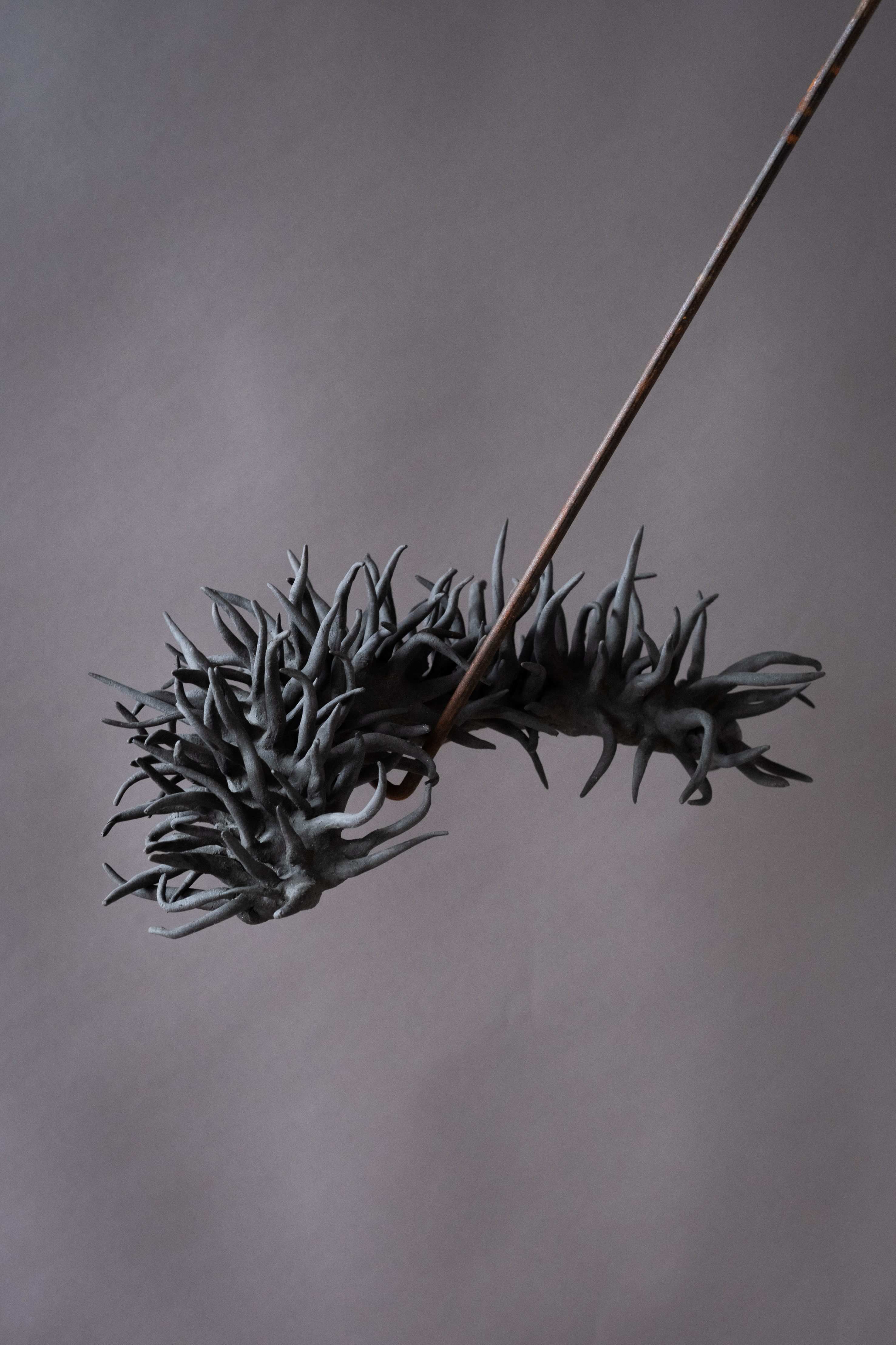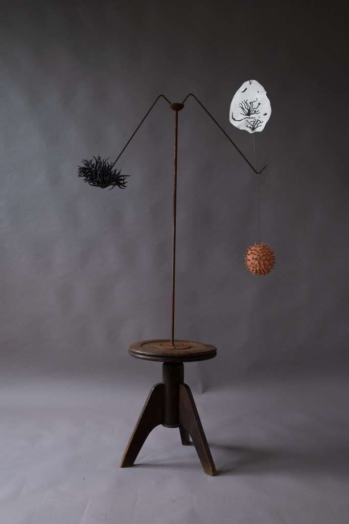 For Undergrowth, at County Hall Pottery Gallery I have returned to working kinetically, finding sculptural ways to breathe life into clay and animate it. In Balance is a reflection on the fragile equilibrium that fungi bring to the natural world. Funga’s vital role in decomposing organic matter and returning carbon to the cycle of life is under threat in the current climate crisis. This multi-media rotating piece places the ceramic elements in potential jeopardy relying on gravity and fulcrum points to keep the sculpted work aloft. A 1920’s revolving piano stool supports a rusting steel mast with a bowl at its apex, in which a cross-bar balances and pivots, in turn supporting ceramic forms. The ceramic elements are inspired by an extinct fungi, Potteromyces recently discovered in the Natural History Museum’s fossil collection by Dr Strullu-Derrien, and named after Beatrix Potter, who, though famous for her children’s books, was also a renown mycologist in her day. Playing with scale, a ceramic fossil of Potteromyces, teeters above a terracotta fungal spore, which is counterbalanced by a three dimensional version of the fungi.