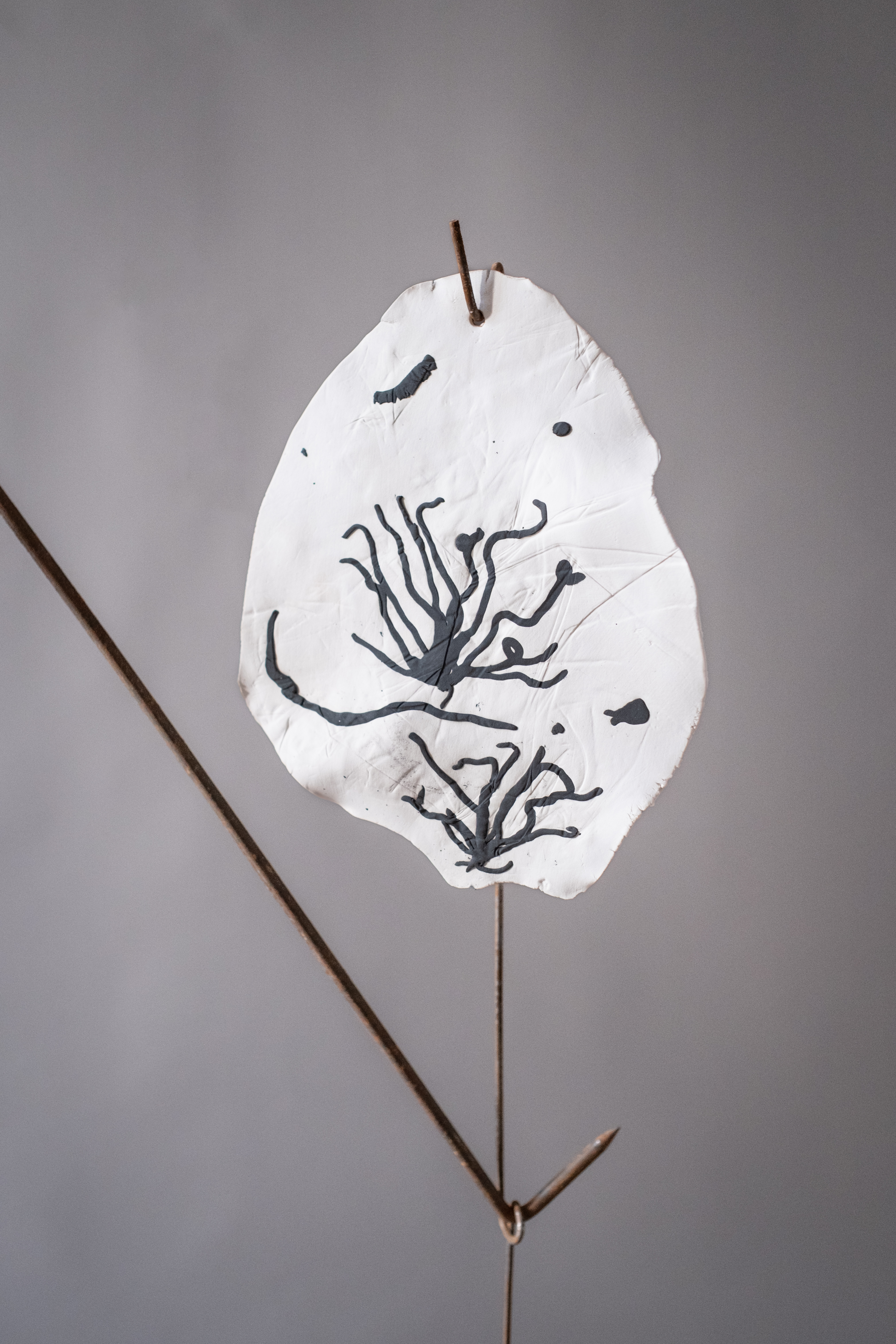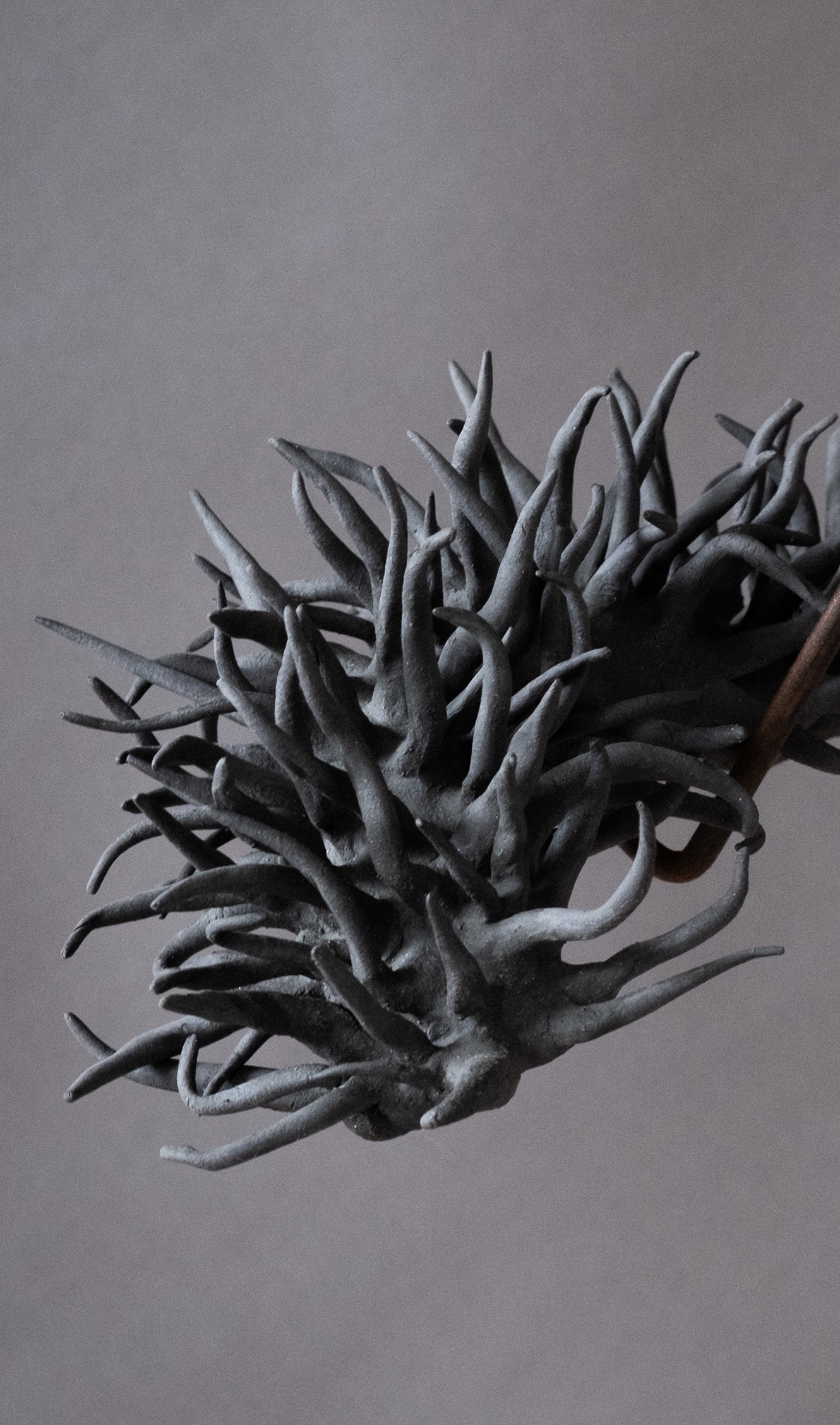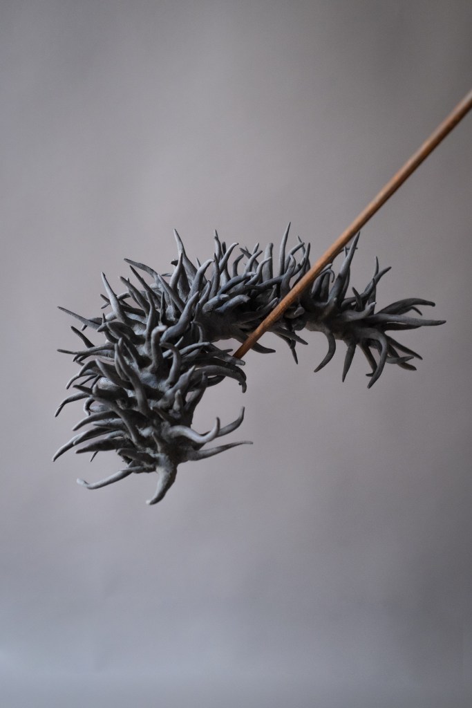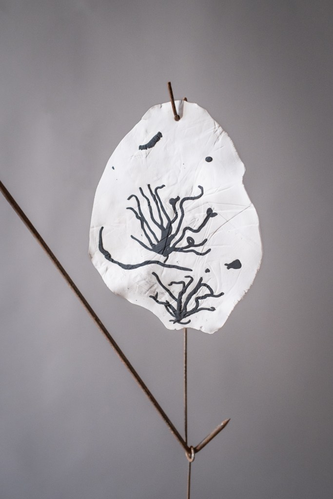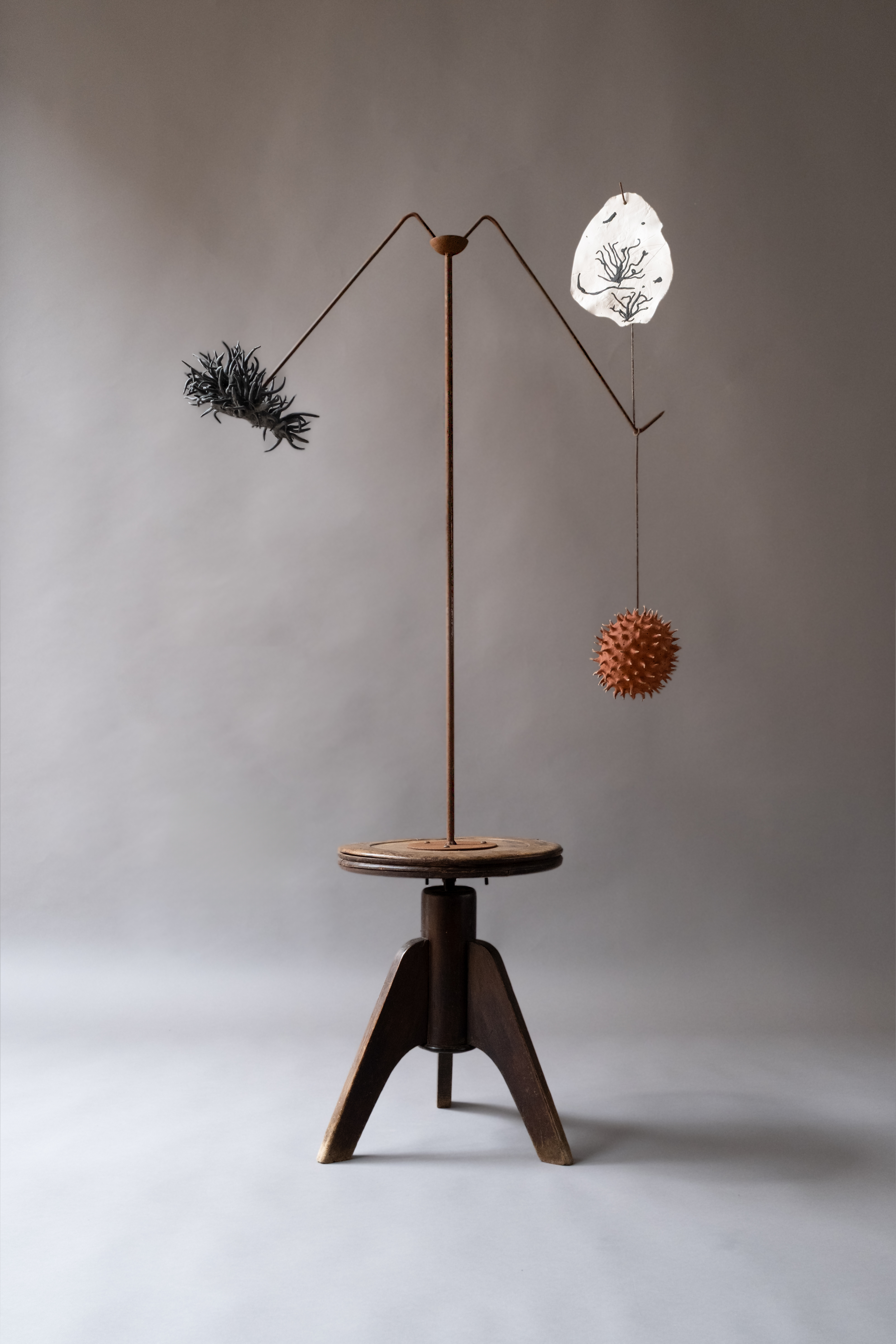 In Balance is a reflection on the fragile equilibrium that fungi bring to the natural world. Funga’s vital role in decomposing organic matter and returning carbon to the cycle of life is under threat in the current climate crisis. This multi-media rotating kinetic work places the ceramic elements in potential jeopardy relying on gravity and fulcrum points to keep the sculpted work aloft. A 1920’s revolving piano stool supports a rusting steel mast with a bowl at its apex, in which a cross-bar balances and pivots, in turn supporting ceramic forms.