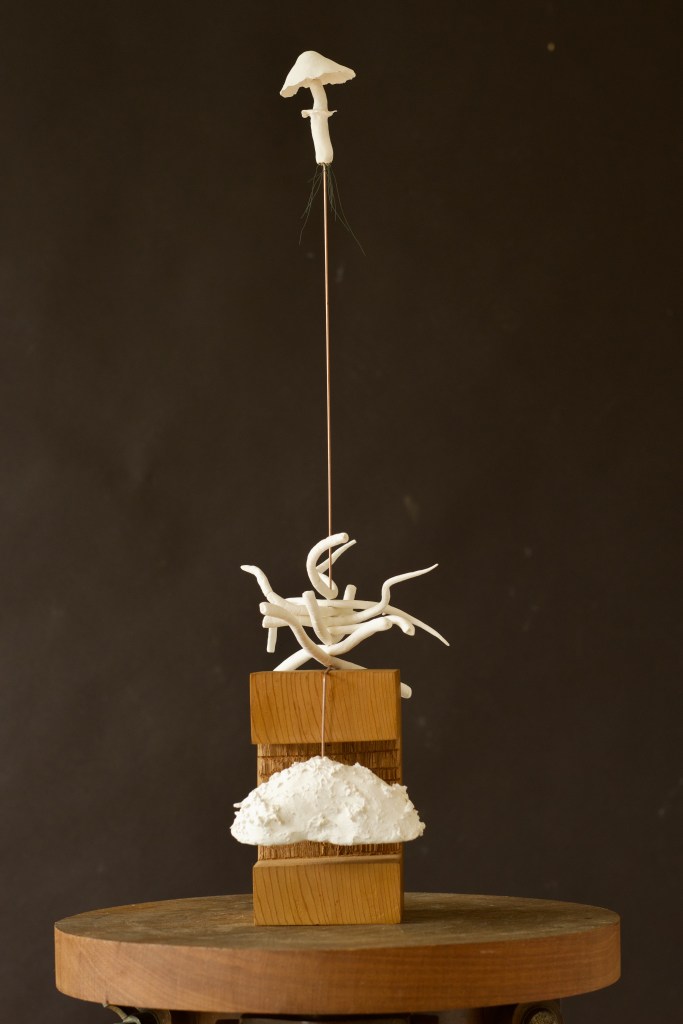 Kinetic ‘stabiles’ are another way Pearl breathes life into her sculptures. Inspired by heroes such as Alexander Calder and Juan Miro, this body of work sets her ceramic microbial forms spinning, swinging and teetering in space. The ceramic microorganisms are delicately balanced on metal rods, speaking to the fragile equilibrium of our soil’s biome. The gently rotating works beguile and enliven our sense of these microscopic beings’ importance and vulnerability.